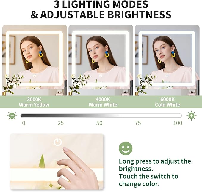 - 【HD Mirror with Smart Lighting】Get salon-perfect lighting for every look with the white vanity with lighted mirror. The girls vanity features a premium illuminated mirror with 3 adjustable lighting modes: cool white for precise makeup, warm white for natural daily looks, and warm yellow for soft vibes. Simply hold to adjust brightness, touch to switch between 3 lighting modes.