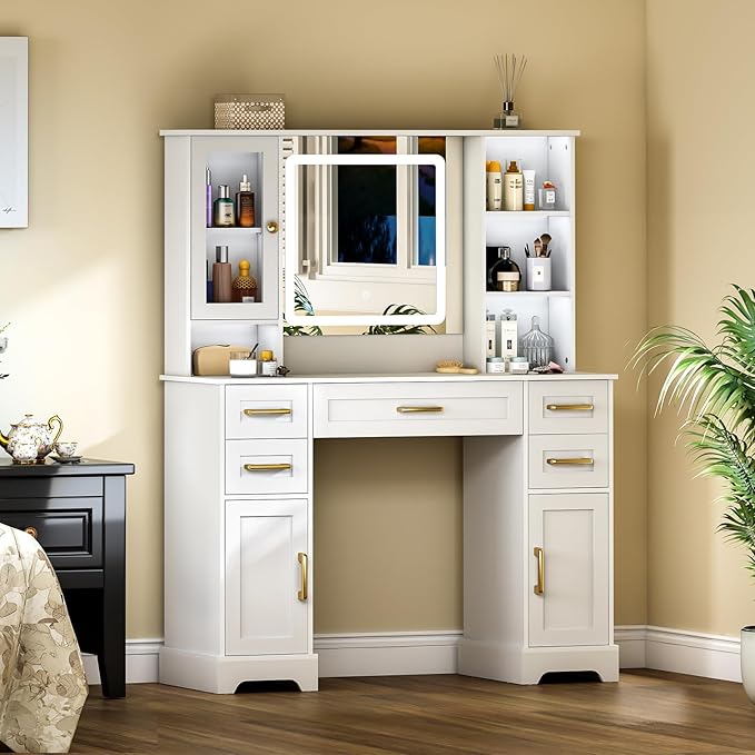- 【Ample Divided Storage】The vanity with lights offers a complete storage solution featuring: roomy top, dust-free glass cabinet, 3 open shelves, 5 silent-glide drawers & 2 spacious base cabinets with 3-height adjustable (and removable) shelves - organize everything from lipsticks to large bottles. The makeup table ensures every beauty essential has its perfect spot.