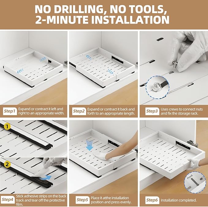 2 Pack Expandable Pull Out Cabinet Organizer, Width (12"-19" ) & Depth (16.5"-22")No Drill Adjustable Cabinet Pull Out Shelves for Kitchen,Pantry, Adhesive Roll Out Shelves for Kitchen Cabinets-White