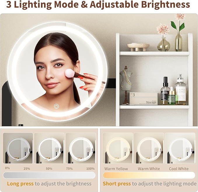 - 【LED Mirror with 3 Lighting Modes】Equipped with a smart LED mirror featuring 3 adjustable lighting modes (warm, natural, and white), this small vanity helps you achieve flawless makeup under any lighting condition. Touch control makes switching light easy and intuitive.