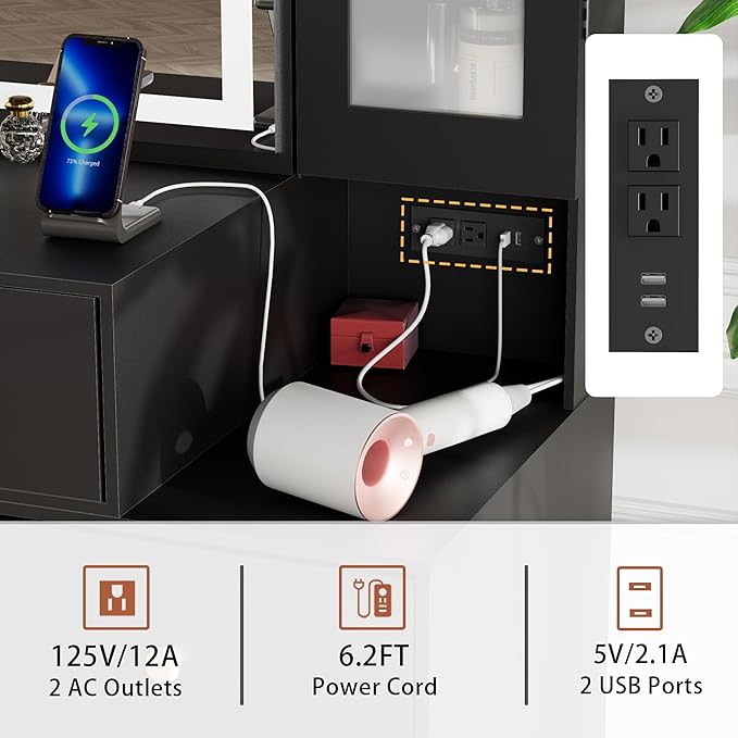 - Vanity Desk set with large storage space: The black dressing table with dressing stool has 5 large drawers, 1 table storage cabinet and a large hidden storage compartment behind the sliding mirror, so that your desktop is no longer messy and all cosmetics can be accommodated