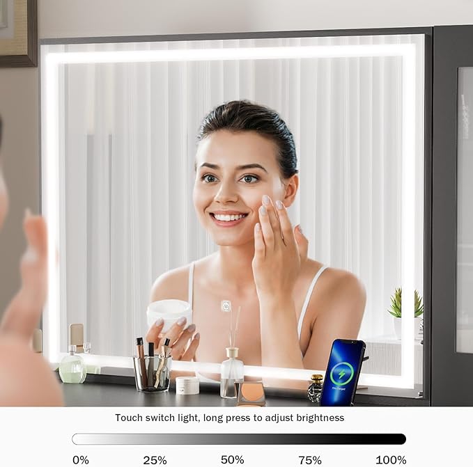 - Big Vanity Mirror with Adjustable Light:: The 37.5-inch large makeup mirror has a built-in LED light with variable brightness. Touch to turn the light on or off, and long press to adjust the brightness.