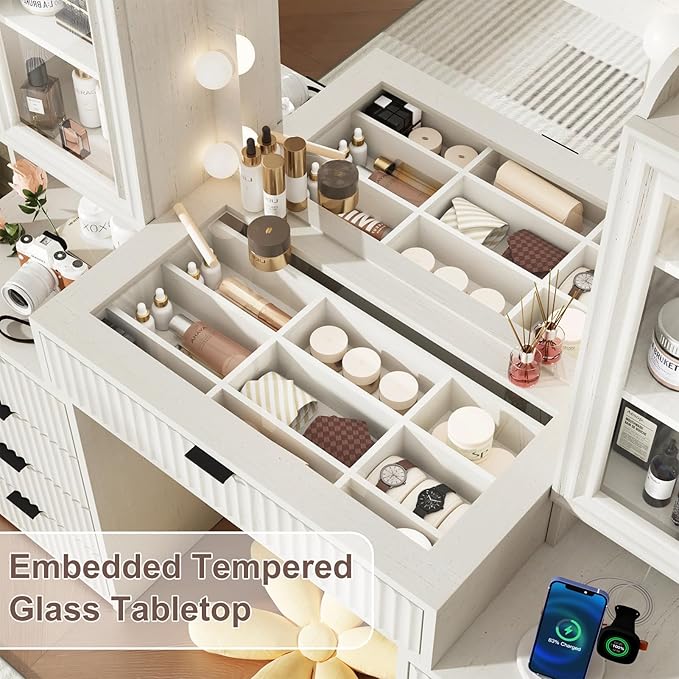 55" Fluted Makeup Vanity Desk with Large Mirror and Lights, Modern Glass Top Big Vanity Table with 9 Drawers & Open Storage Shelves, Dressing Table w/Charging Station for Bedroom, White