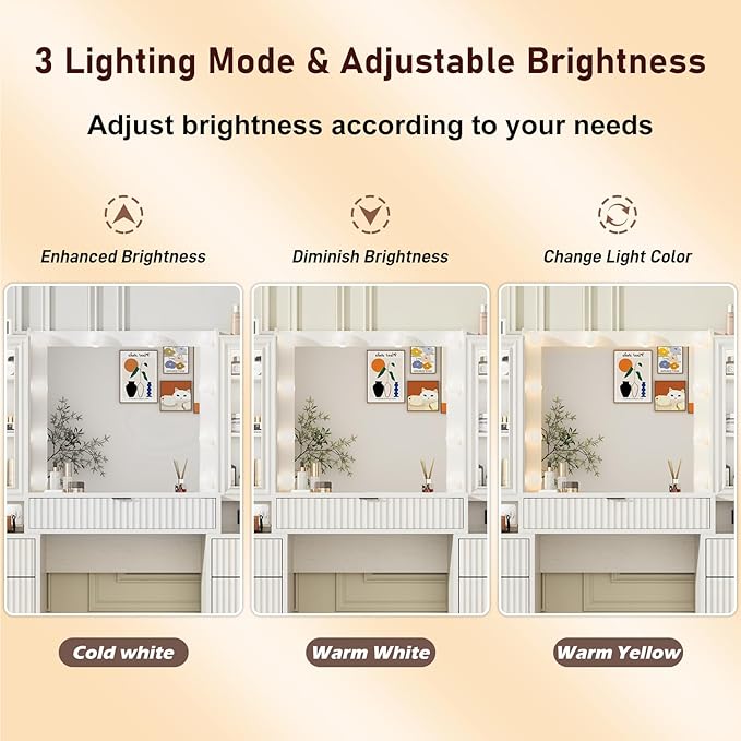- Large Vanity Table with 9 Drawers: This large vanity table includes 9 spacious drawers, providing ample space to organize your beauty essentials, accessories, and makeup tools for easy access and tidy organization.