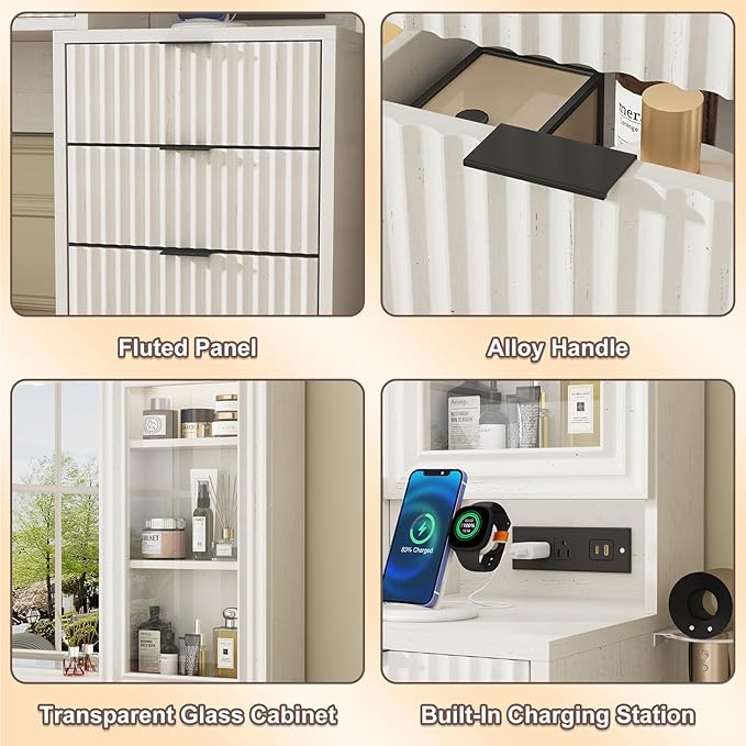 - Stylish Design: The 55" Fluted Makeup Vanity Desk features a modern glass tabletop paired with a sleek fluted design, making it a stunning addition to any bedroom décor, enhancing both aesthetics and functionality.