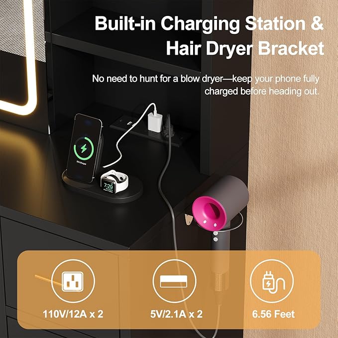 - 【Charging Station & Hair Tool Holder】Plug in and power up with 2 USB ports and 2 AC outlets—no more messy extension cords. Whether you're using your curling wand, straightener, or charging your phone, this makeup table with charging station keeps everything within reach. A built-in hairdryer holder saves time and keeps tools neatly stored.