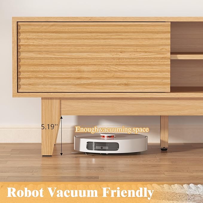 - Ideal Dimensions: Measuring: 59"L × 15.35"W × 17.72"H, this TV stand is crafted from durable P2-engineered wood for lasting durability. The oversized waterproof, scratch-resistant tabletop accommodates TVs up to 55", 65", or 70". Elevated 5.2-inch feet create clearance for robot vacuums to clean freely underneath