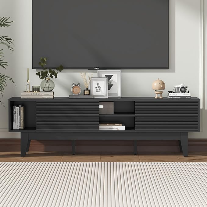 Wooden Fluted TV Stand for 55 65 70 inch TV, Long & Large TV Media Console Table with Storage Cabinets, Boho Farmhouse Entertainment Center for Living Room, Bedroom - Black