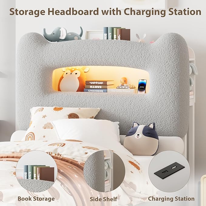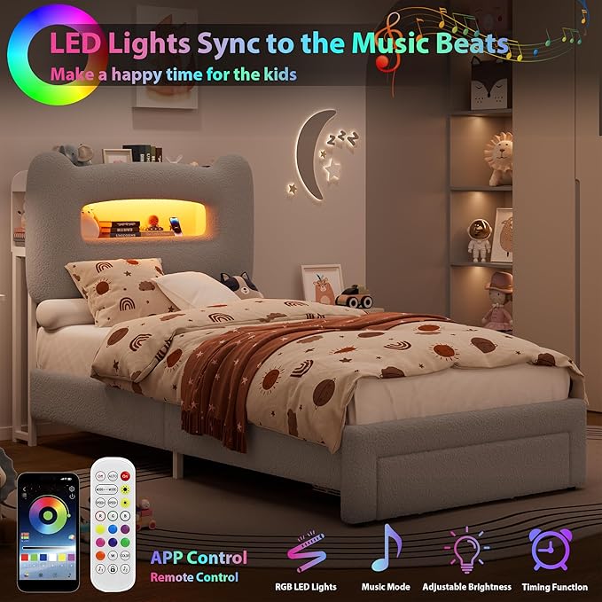 GarveeHome Upholstered Twin Bed Frame with 2-Tier Storage Headboard, LED Platform Bed with Charging Station and Drawer for Kids/Girls/Boys, Heavy Duty Metal Support, No Box Spring Needed, Grey