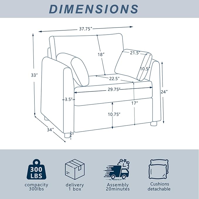 - 【Easy Assembly Couch】Each single sofa chair comes in one box , the packaging is vacuum compressed. First, carefully cut open the compressed bag (make sure not to cut through the packaging material)then remove it. Afterwards, perform operations such as patting and kneading to accelerate the process of making it fluffy.