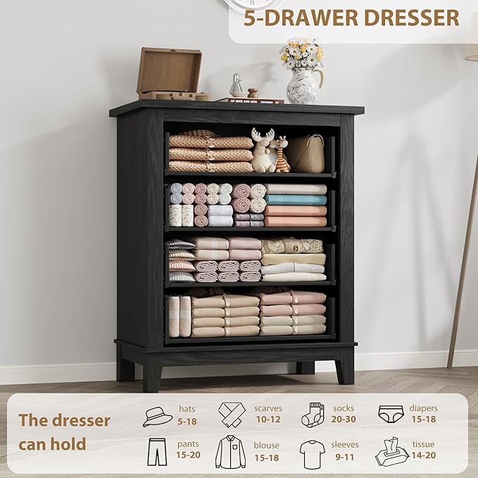 - AMPLE STORAGE SPACE: Equipped with five ultra-deep drawers, this dresser provides plenty of space for all your daily essentials. The spacious desktop is perfect for displaying small items, lamps, or décor to enhance your room’s style