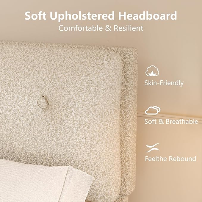 - Pull Button Headboard Design: The queen size bed frame with headboard comes with a pull button design, also removable for easy cleaning, refresh your bedroom. The soft boucle fabric keeps you warm and the soft padding material feel cozy to the touch