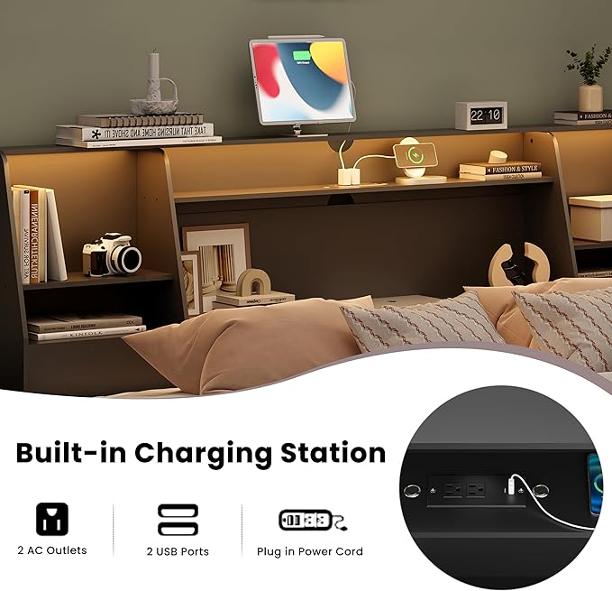 - 【Built-in Charging Station & Soft Light】Our Queen headboard comes with 2 built-in standard AC power outlets and 2 USB ports, giving you the flexibility to charge your phone, tablet, headphones, book lights and other electronic devices while relaxing or working. Extra long light belt with eye protection light to protect your eyes
