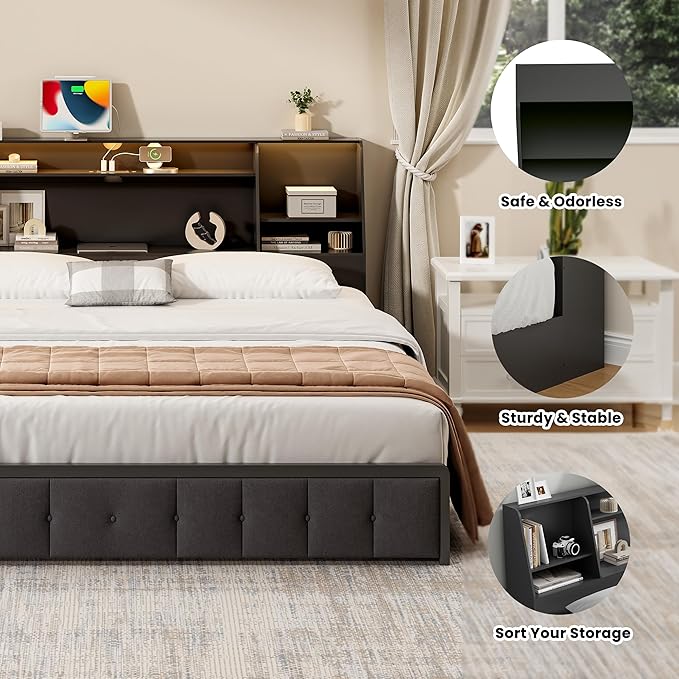 - 【Ample Storage Bookcase Headboard】Includes 1 shelf and 4 storage Spaces of different sizes, perfect for organizing alarm clocks, books, glasses and picture frames. And in the middle of the large storage space, you can put some clothes or debris, its unique design can meet your diverse storage needs, so that your room to keep clean.