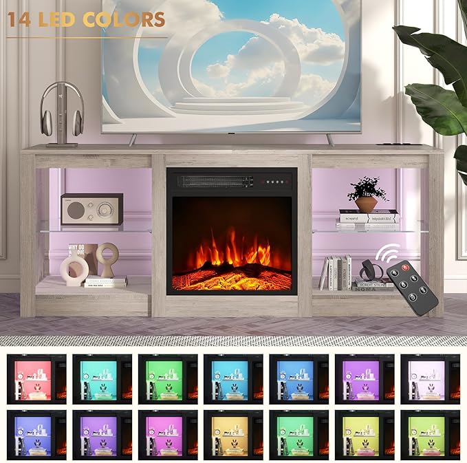 Ludatido 58 Inch TV Stand with 18 inch Fireplace Insert LED Light Entertainment Center Electric Fireplace TV Stand with USB&AC Power Interface for Living Room/Bedroom/Media Room Use(Gray)