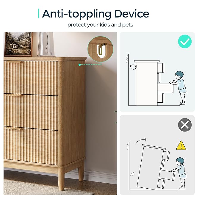 - Safety-Certified Design – Built for peace of mind, this tall dresser meets strict ASTM 2057-2023 safety standards and features rounded edges, wide metal handles, and anti-tip device to prioritize child safety