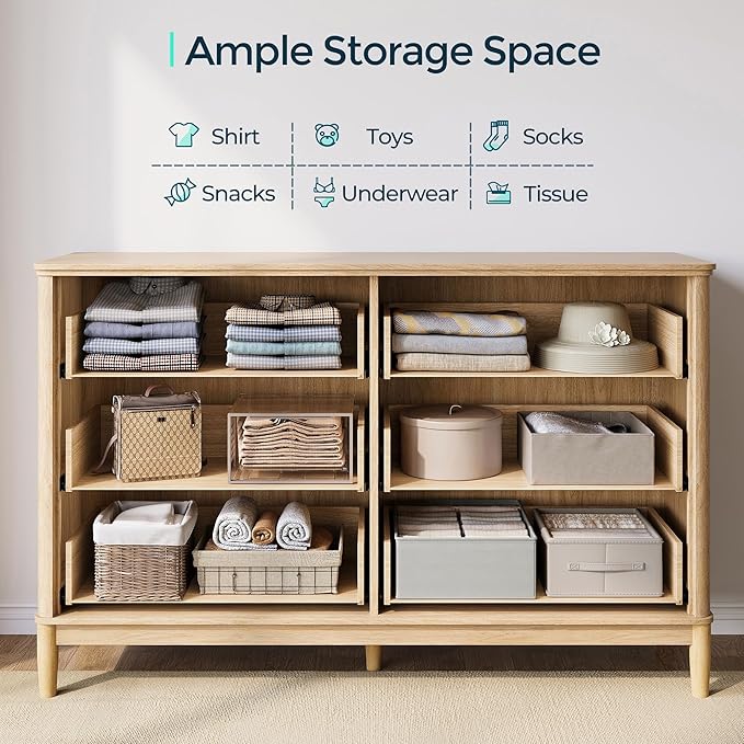 LINSY HOME Fluted Dresser for Bedroom with 6 Drawers, 54" Wide Chest of Drawers, Mid Century Modern Dresser TV Stand with Metal Handle, Wood Closet Storage Cabinet for Living Room, Hallway, Oak