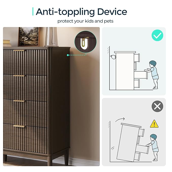 - Safety-Certified Design – Built for peace of mind, this tall dresser meets strict ASTM 2057-2023 safety standards and features rounded edges, wide metal handles, and anti-tip device to prioritize child safety