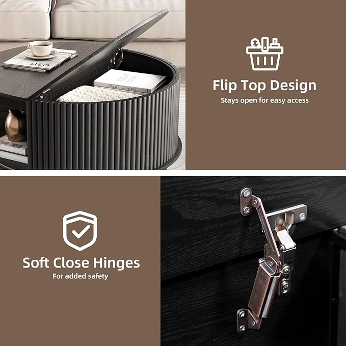 Round Coffee Table with Storage,31.5" Mid Century Modern Coffee Table with Hidden Compartment,Fluted Center Table for Living Room,Home Small Space,Black