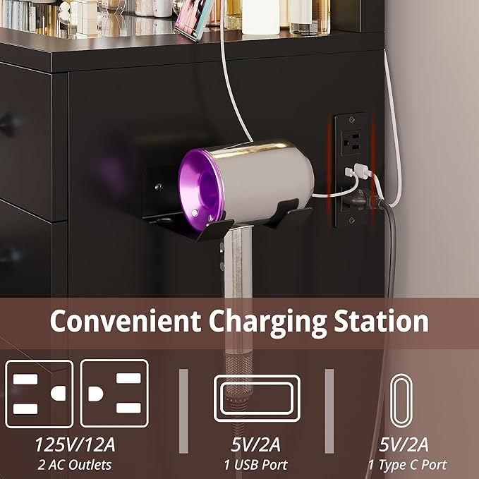 - Convenient Power and Storage: A multi-functional makeup desk that combines 2 standard plug sockets, 1 USB port, 1 Type-C port, and 1 hair dryer rack so your hair dryer, mobile phone, and curling iron can be within arm’s reach; Glam makeup vanity for dressing room, bedroom, salon, or live broadcast