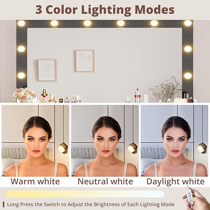 - Large LED Mirror with Adjustable Lighting: This black vanity set features a generously sized 46" x 24.4" mirror with built-in 12 LED lighting bulbs. The LED bulbs offers 3 distinct color modes, allowing you to easily adjust the brightness to create the perfect lighting setup for detailed makeup application. The expansive mirror size provides ample visibility to ensure a flawless look