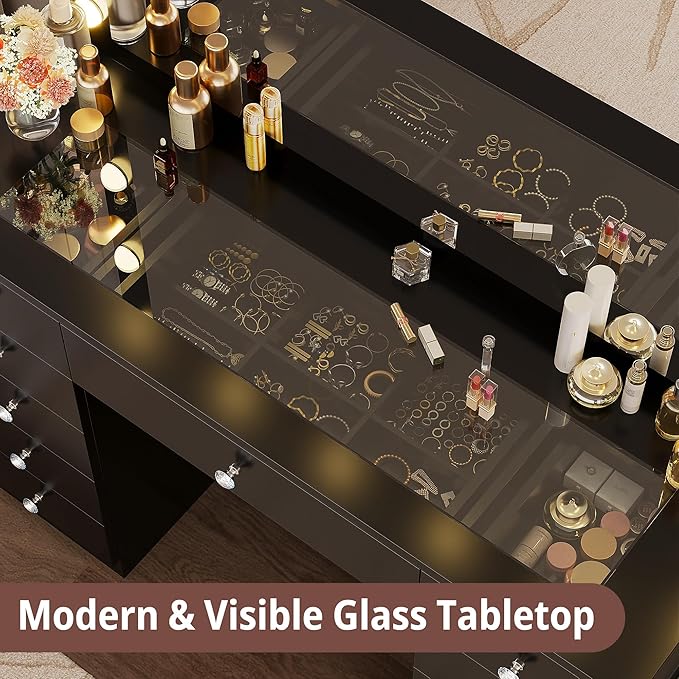 - Spacious Glass Tabletop Vanity: The tempered glass tabletop offers ample space for display while allowing a clear view of items stored in the drawers. Its sleek, transparent design adds a modern and sophisticated touch, seamlessly blending into any bedroom, dressing room, or salon