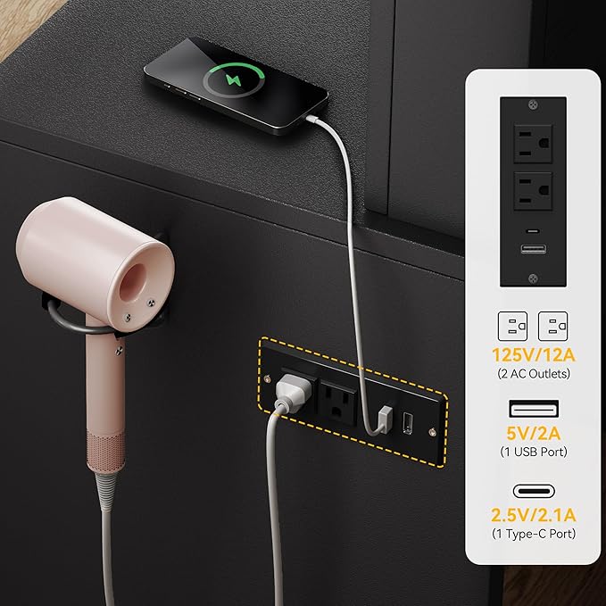 - Integrated Charging Hub: Built-in power station with 2 AC outlets and 2 USB ports. Conveniently placed near the mirror for hair tools and devices