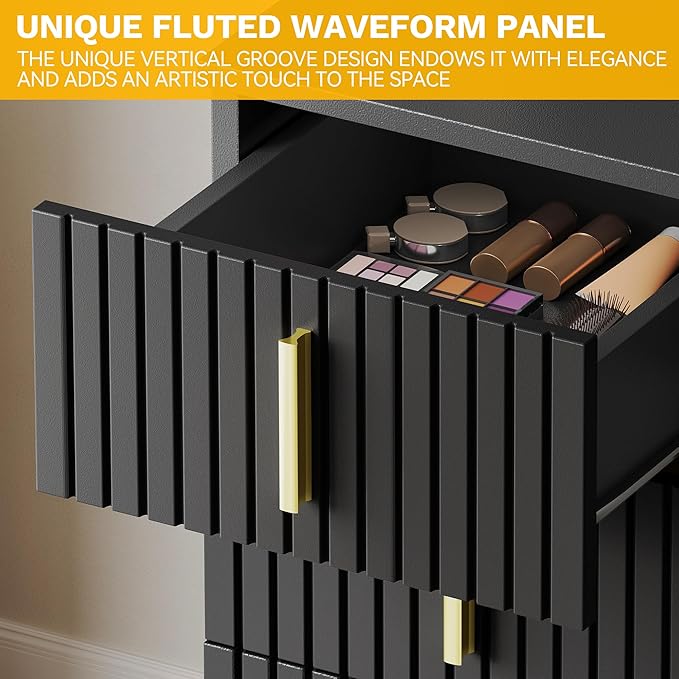 YITAHOME Vanity Desk with Mirror and Power Outlet, Fluted Vanity Table Set with Hidden Jewelry Storage, Big Makeup Desk with 4 Drawers, Black Dressing Table with Cushion Stool, 3 Lighting Color Modes