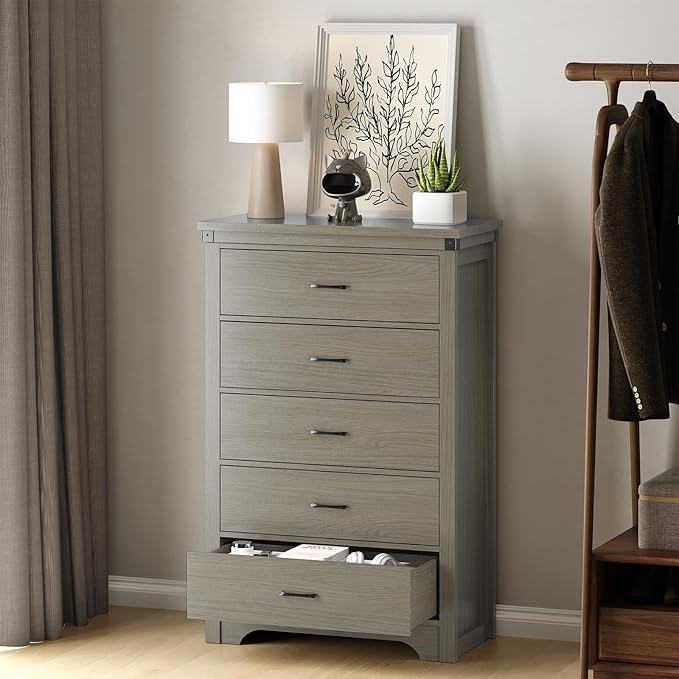 Farmhouse 5 Drawer Dresser for Bedroom, 47" Tall Chest of Drawers, Wood White Dresser with Deep Drawers, Storage Dressers Organizer for Bedroom, Living Room, Hallay, Grey
