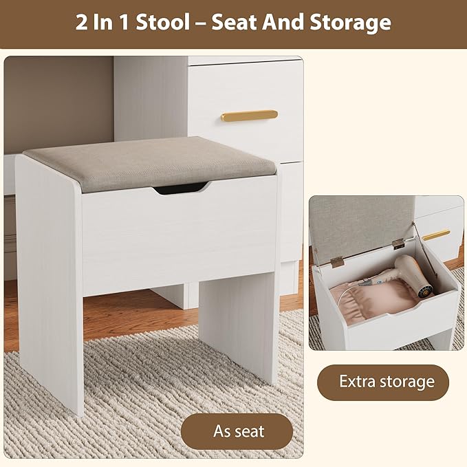 - 【Built-in Power Outlet】This vanity table comes with an integrated charging station, featuring 2 USB ports and 2 standard outlets. It offers convenient charging for phones, headsets, iPads, laptops, fans, hair tools like curling irons, straighteners, blow dryers, and other beauty devices. Transform your makeup table into a practical multi-functional space where you can both get ready and charge your devices without any hassle.