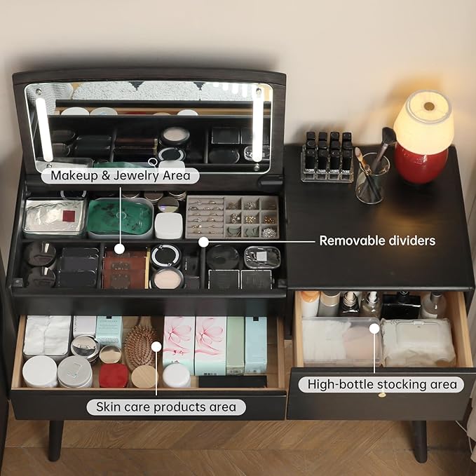 - đăAdjustable Drawer DividersăThe small solid wood vanity table and the dividers inside the drawers are adjustable to cosmetic sizes. The ultimate in organizing your skincare products without wasting space.