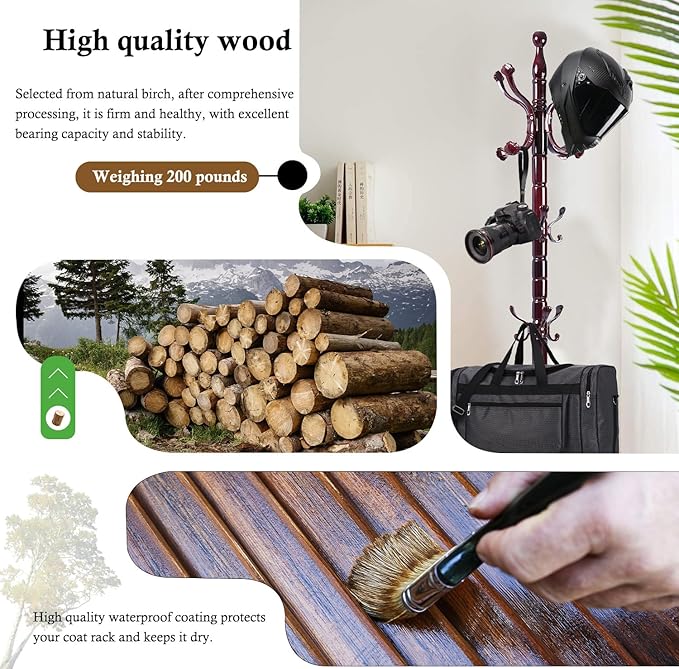 - 【Wider Application】The wooden coat tree is designed in a vintage style, with a simple structure and comprehensive functions. The coat rack can be placed in the hallway, living room, bedroom, office, and any corner you need. The wooden coat tree stand adopts an embedded screw design and is connected to the main pole, and the full-tooth screw is connected to the chassis. Equipped with installation tools and instructions, you can easily complete the installation.