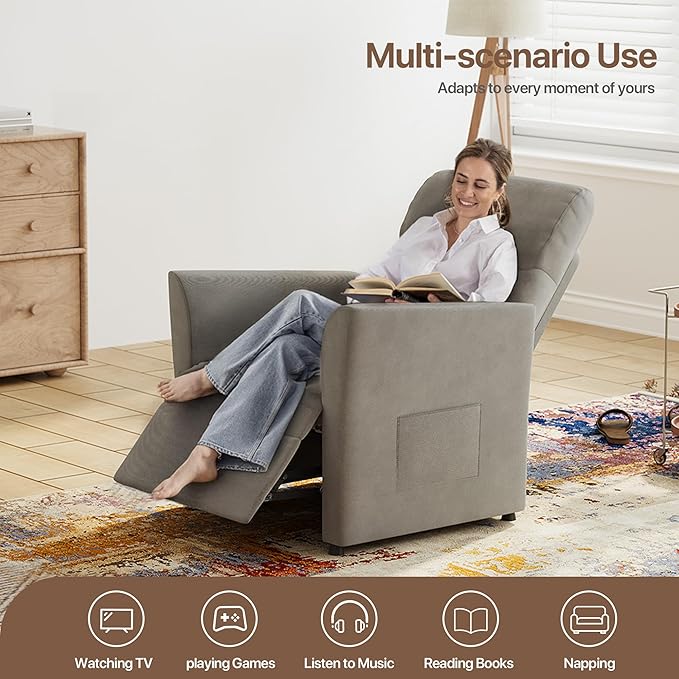 - Quality and Convenient Details: The small recliner chair has a remote control that allows you to choose your personal favorite mode, and it is also paired with a side organizer pocket to hold your phone and remote control in a neat and organized manner.