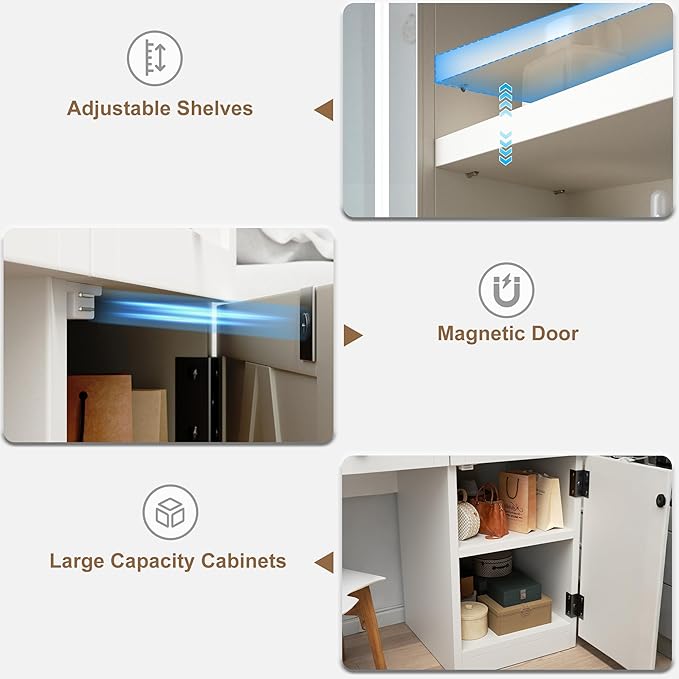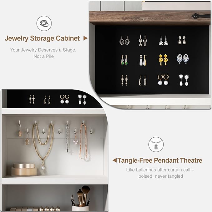 - JEWELRY STORAGE AREA: This vanity desk with mirror and lights features dedicated compartments for earrings and rings, fitting up to 20 pairs of earrings. The makeup table includes a bracelet and necklace hanging area, paired with adjustable shelves, can be up to 14 inches high, ensuring even long necklaces hang elegantly without tangling. Say goodbye to clutter and lost items—enjoy clearly displayed jewelry at a glance for effortless access to your favorites.