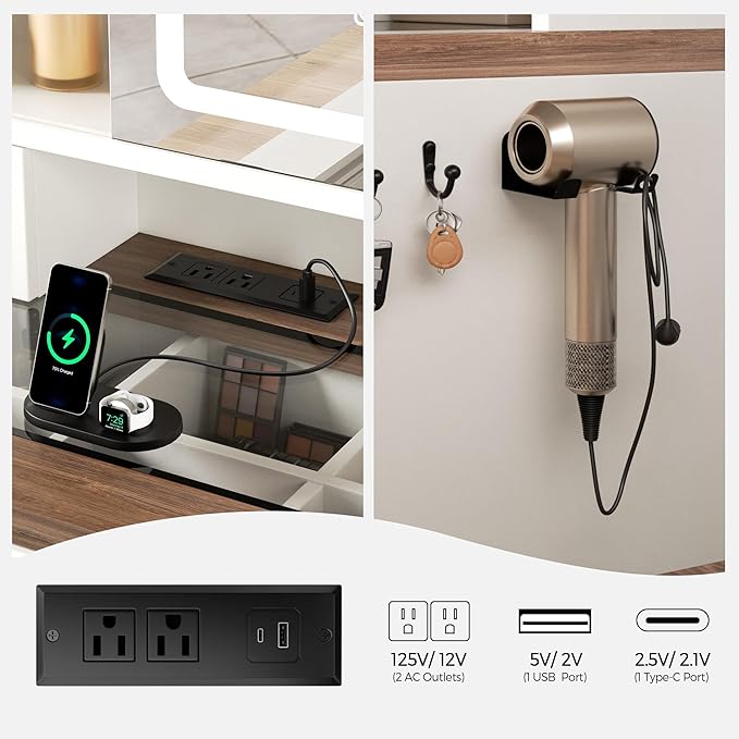 - All-in-One CHARGING HUB: Feeling rushed in the morning while getting ready? This makeup desk features 2 AC outlets + 1 USB-A port + 1 Type-C fast-charging port, allowing you to safely and conveniently power your hairdryer and curling iron while charge your phone via the Type-C port. Say goodbye to the hassle of searching for outlets and dealing with messy power strips—your farmhouse vanity table instantly becomes an efficient energy station.