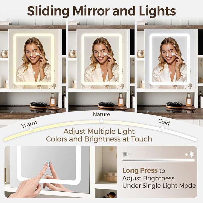 - SLIDING LIGHTING MIRROR: The vanity table mirror with lights can be slid from side to side, and the back hidden 3-tier adjustable storage shelves. Lightly touch to switch between three lighting modes simulating the warm, cool and natural light, or long press to adjust brightness. Whether you're applying makeup, styling hair, or skincare, you can easily create the ideal lighting mood, making your daily beauty routine more enjoyable and relaxing.