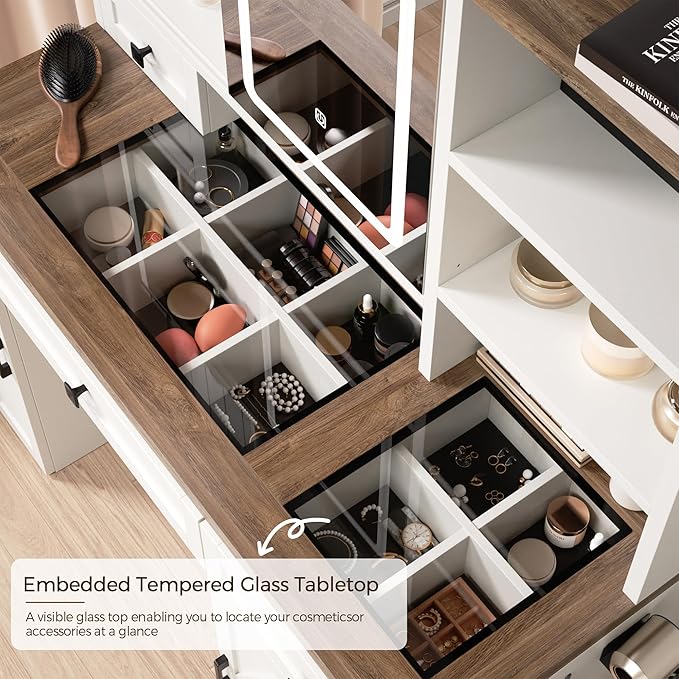 - VISIBLE GLASS TOP: This makeup vanity desk with lights measures 47.2" W x 15.7" D x 53.1" H, and the thickest part of the tabletop is 0.79 inches. The white vanity with glass top is made of transparent tempered glass with a dust-proof and water-resistant surface. The two drawers under the table are designed with a 2x3 and 2x2 compartment layout, so you can easily find your cosmetics or accessories in a snap. Access your items in seconds--skip the search!