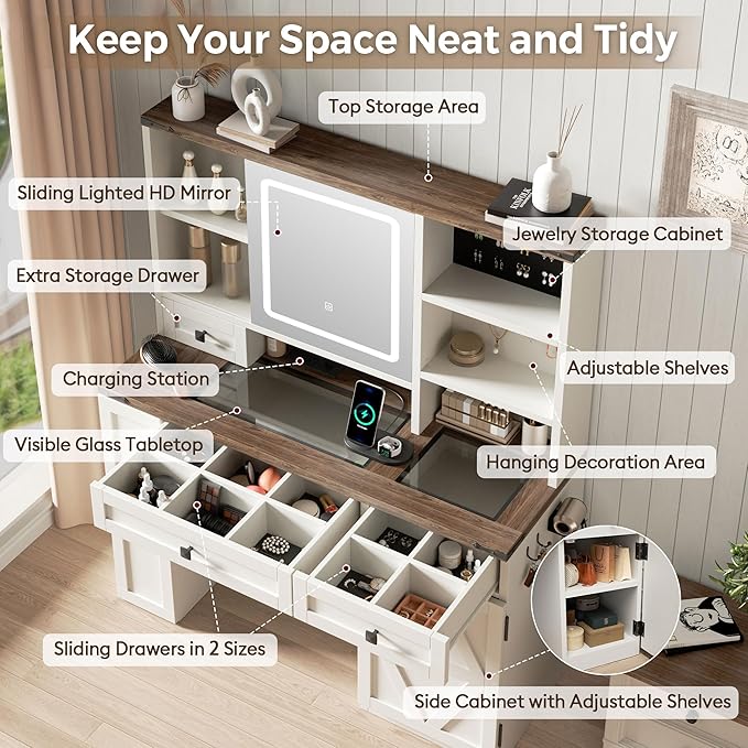 Farmhouse Makeup Vanity Desk with Sliding Mirror and Lights, Glass Desktop Makeup Vanity Desk with Charging Station, 3-Tier Hidden Slide-Out Vanity Shelves, Jewelry Storage Cabinet, 2 Drawers-White