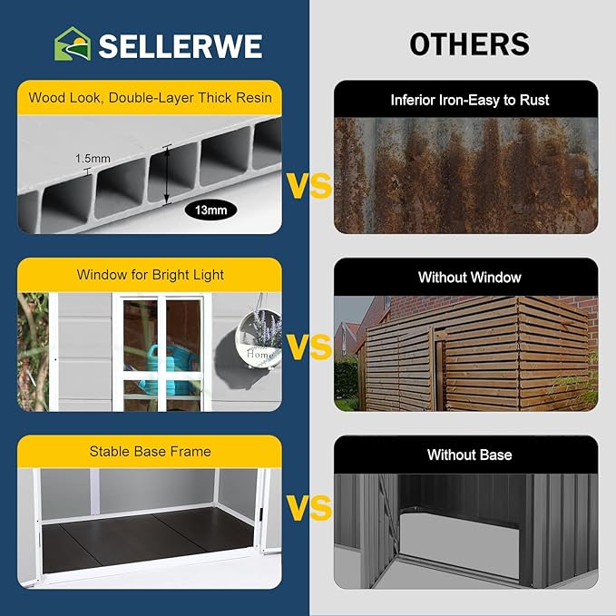 - š”[PREMIUM MATERIAL STORAGE SHED WITH FLOOR]: The 13mm tough double-wall resin construction and impact-resistant floor are designed for long-term durability. The double-wall panels are waterproof and moisture-proof, allowing worry-free use in all weather conditions. It is weather-resistant, waterproof, and UV-resistantāno peeling, rotting, or rusting. The screws are embedded to ensure aesthetics and safety.