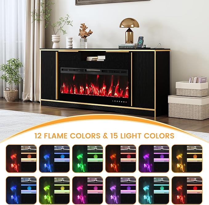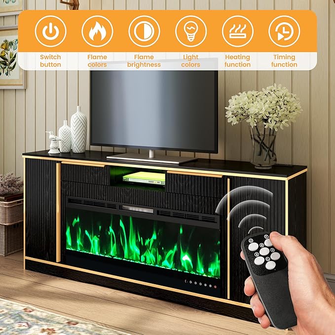 - Remote Control: This fireplace TV stand has 2 remote controls, one controls the electric fireplace, and the other controls the led light strip inside the cabinet, which can be adjusted to 15 colors (led light strips need to be self-adhesive to the TV stand)