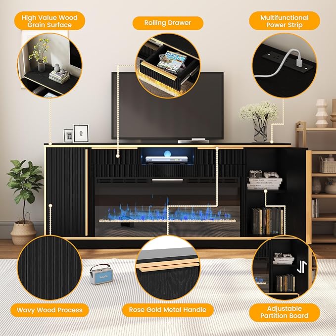 COCO DESIGN Fireplace TV Stand up to 80" TVs, 42" Electric Fireplace TV Console with Crystal Stone, Colorful LED Lights Entertainment Center with Remote Control, Black