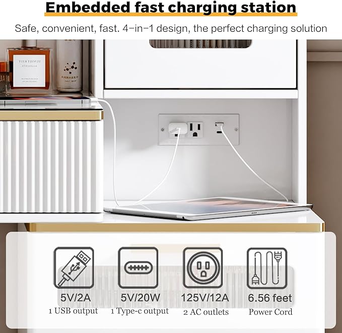 - 【Vanity Table with Charging Station】-This makeup vanity features a charging station, includes 2 standard plug sockets and 2 USB ports, which can be more convenient to connect your hair dryer, curling iron, and it can also charge your phone, tablet or other mobile devices, The unique design is more convenient for you to use.