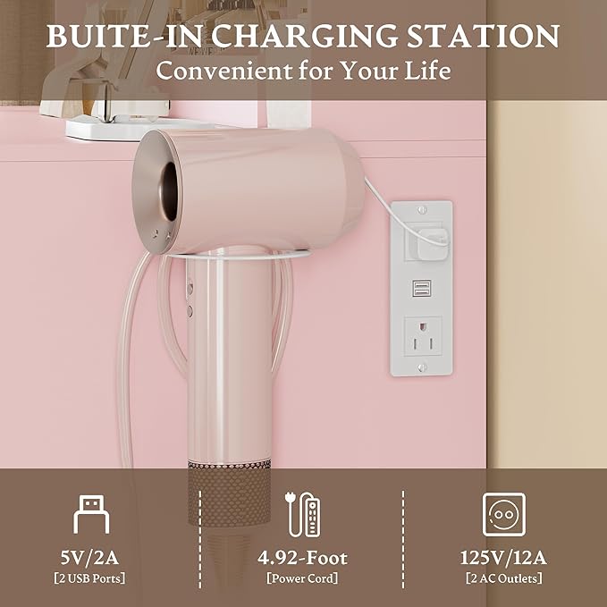 - 【Convenient Power Strips & Hair Dryer Rack】This vanity table contained a built-in power station, including 2 AC outlets and 2 USB ports. Beyond this, Our vanity desk with mirror and lights provides a perfect spot to hold your hair dryer and curling iron or hair straighter. Give your hair excellent style design. Excellent vintage vanity to take beautiful selfies after applying makeup