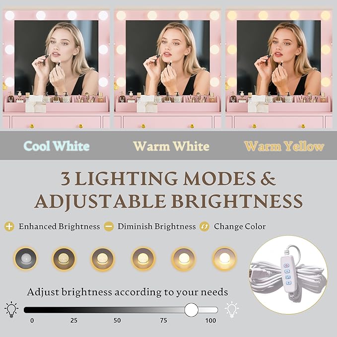 - 【Mirror with 3 Lighting Modes】This makeup vanity desk with lights equipped with a mirror with 8 Hollywood lightbulbs. Provide 3 different lighting modes : Cool White / Warm White / Warm yellow. The brightness is adjustable. Perfect for your daily makeup, excellent for home makeup, salon, and live broadcast. Feel like a star with our premium makeup vanity