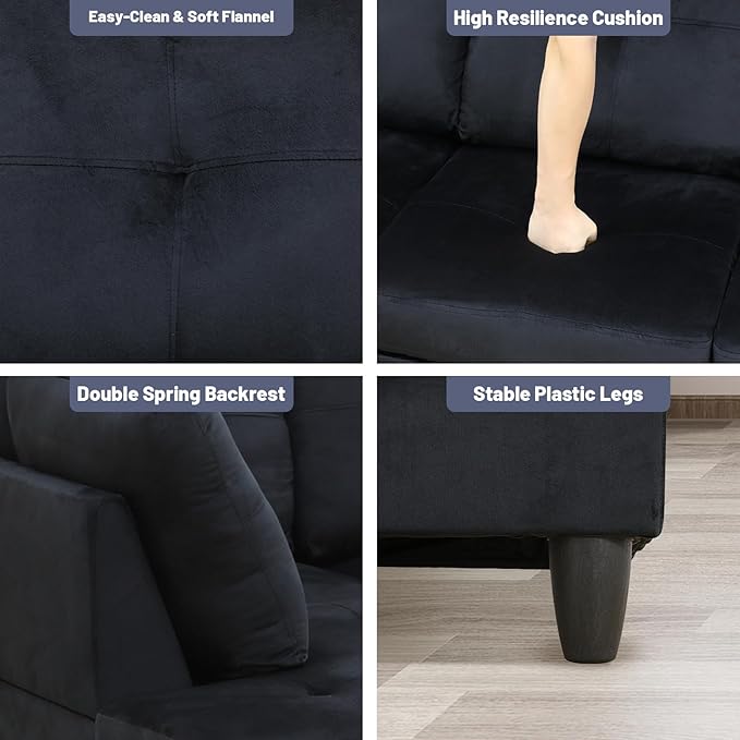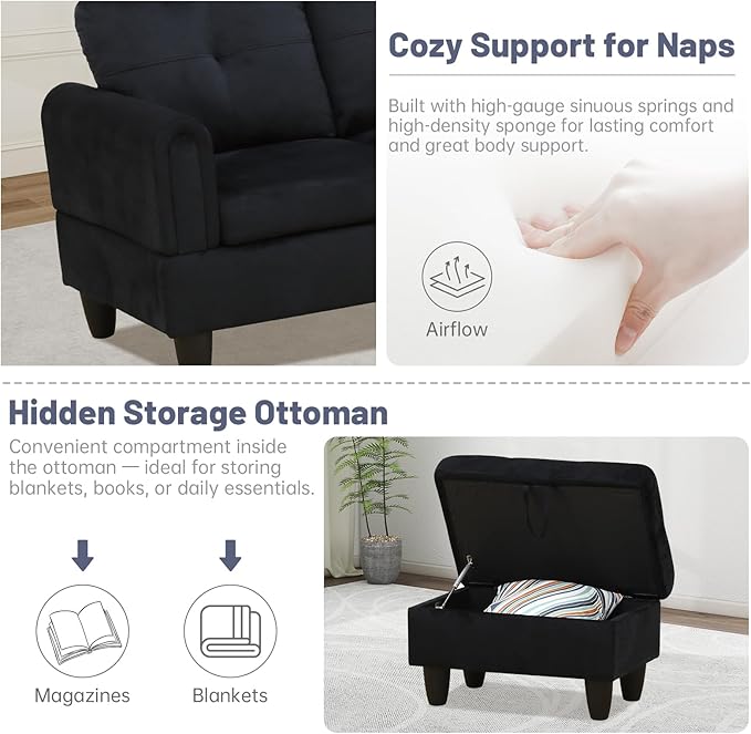 L-Shape 3-Piece Cloud Sofa, Couch for Living Room, BlackFlannel Fabric L-Shape with Reversible Chaise & Storage Ottoman, Ergonomic 110–115° Recline, Solid-Wood Frame