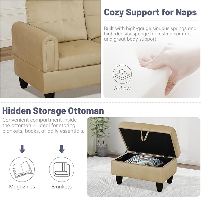 L-Shape 3-Piece Cloud Sofa, Couch for Living Room, Beige Flannel Fabric L-Shape with Reversible Chaise & Storage Ottoman, Ergonomic 110–115° Recline, Solid-Wood Frame