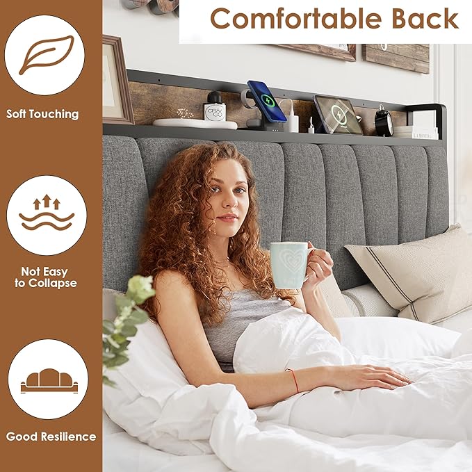 - 【Convenient Storage Headboard with Charging Ports】: Transform your bedroom into a functional and stylish space with our farmhouse bed frame featuring a storage headboard. This headboard comes equipped with 2 USB ports and 1 Type-C port, making it effortless to charge your devices while lounging or reading in bed. The chic linen upholstery not only enhances your room's aesthetic but also provides a comfortable backing, perfect for those cozy nights spent catching up on your favorite books.
