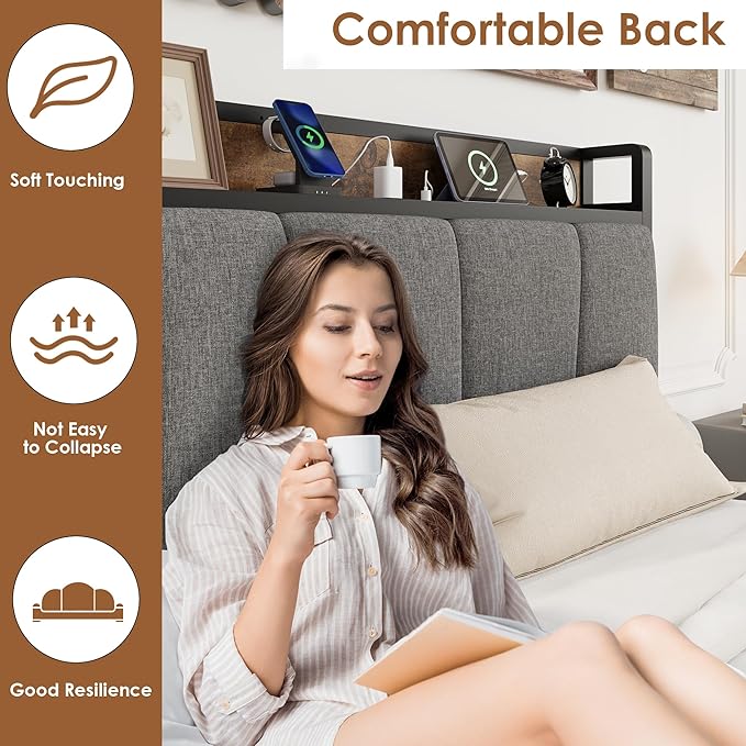 - 【Storage Headboard with Charging Station】This bed frame with storage headboard allows you to easily store small items such as phones, glasses and books. It is equipped with 2 USB ports and 1 Type-C port, providing a maximum of 5v/3a for fast charging efficiency. The linen upholstered headboard not only adds a stylish touch to your room, but also allows you to comfortably lean back to read books or use your phone.