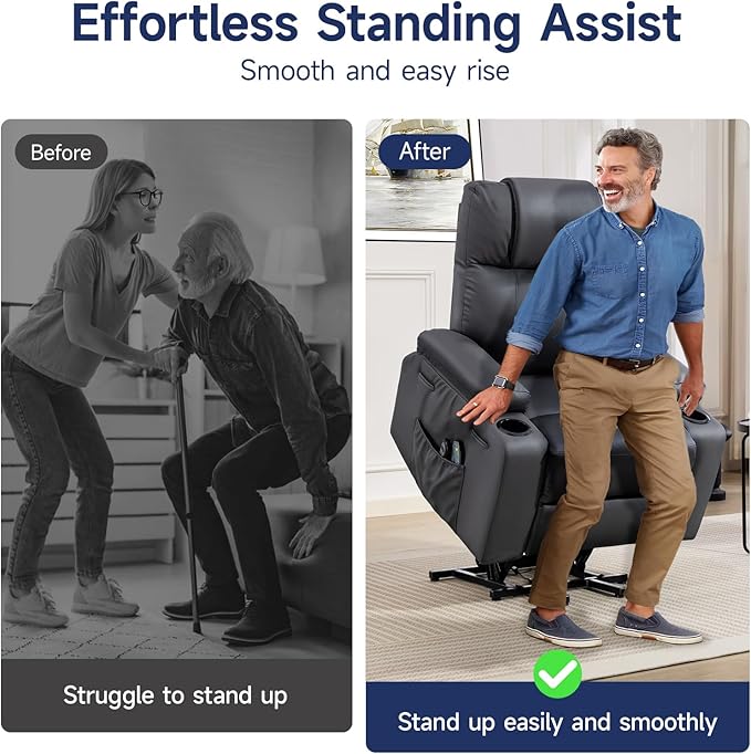- 【Power Lift Recliner for Seniors – Easy Standing Assist】Equipped with a smooth and quiet electric lift mechanism, this power lift recliner chair helps seniors and people with limited mobility stand up effortlessly without straining knees or back. Ideal for seniors and designed for daily convenience.
