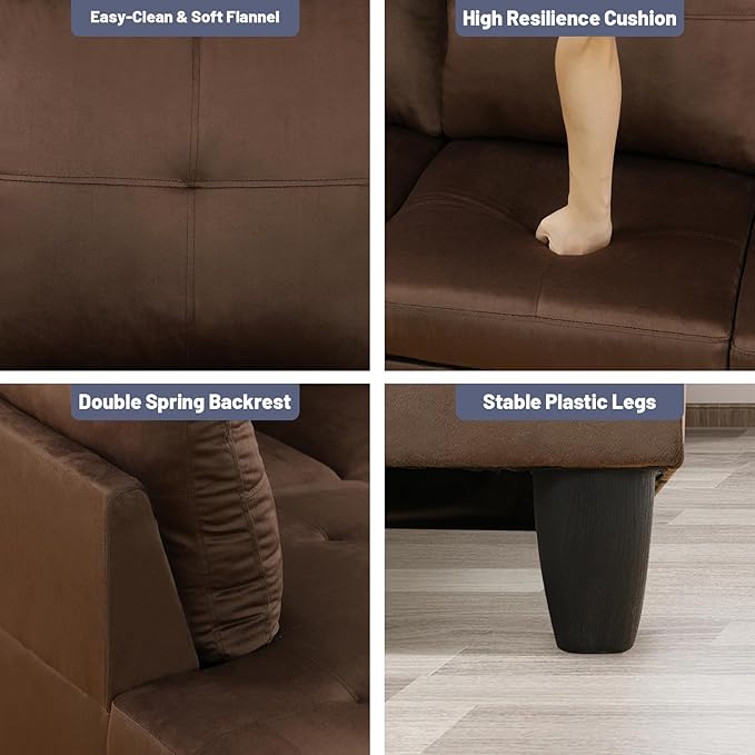 L-Shape 3-Piece Cloud Sofa, Couch for Living Room, Chocolate Flannel Fabric L-Shape with Reversible Chaise & Storage Ottoman, Ergonomic 110–115° Recline, Solid-Wood Frame